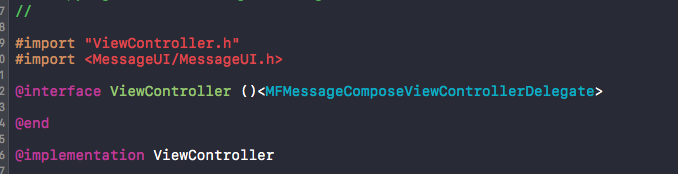 3.添加協議:<MFMessageComposeViewControllerDelegate>