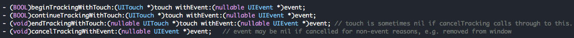 - (void)endTrackingWithTouch:(UITouch *)touch withEvent:(UIEvent *)event { [super endTrackingWithTouch:touch withEvent:event]; if ([self.delegate respondsToSelector:@selector(starsControl:didChangeScore:)]) { [self.delegate starsControl:self didChangeScore:self.score]; }} - (void)cancelTrackingWithEvent:(UIEvent *)event { [super cancelTrackingWithEvent:event]; if ([self.delegate respondsToSelector:@selector(starsControl:didChangeScore:)]) { [self.delegate starsControl:self didChangeScore:self.score]; }}