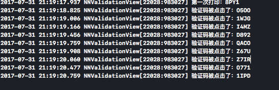 __weak typeof(self) weakSelf = self; /// 返回驗證碼數字 _testView.changeValidationCodeBlock = ^(void){ NSLog(@"驗證碼被點擊了:%@", weakSelf.testView.charString); };