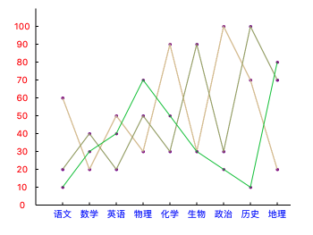 //1.初始化 _bezierView = [BezierCurveView initWithFrame:CGRectMake(30, 30, SCREEN_W-60, 280)]; _bezierView.center = self.view.center; [self.view addSubview:_bezierView]; // 多根折線圖 [_bezierView drawMoreLineChartViewWithX_Value_Names:(NSMutableArray *)@[@"語文",@"數學",@"英語",@"物理",@"化學",@"生物",@"政治",@"歷史",@"地理"] TargetValues:(NSMutableArray *)@[@[@60,@20,@50,@30,@90,@30,@100,@70, @20],@[@20,@40,@20,@50,@30,@90,@30,@100,@70],@[@10,@30,@40,@70,@50,@30,@20,@10,@80]] LineType:LineType_Straight];
