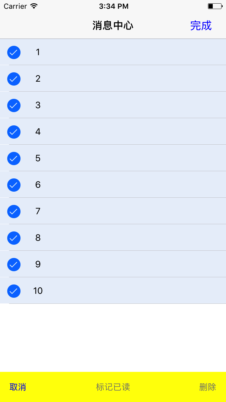 for (int i = 0; i< self.dataArray.count; i++) { NSIndexPath *indexPath = [NSIndexPath indexPathForItem:i inSection:0]; [_tableView selectRowAtIndexPath:indexPath animated:NO scrollPosition:UITableViewScrollPositionTop]; } if (self.deleteArray.count >0) { [self.deleteArray removeAllObjects]; } [self.deleteArray addObjectsFromArray:self.dataArray]; [btn setTitle:@"取消" forState:UIControlStateNormal];