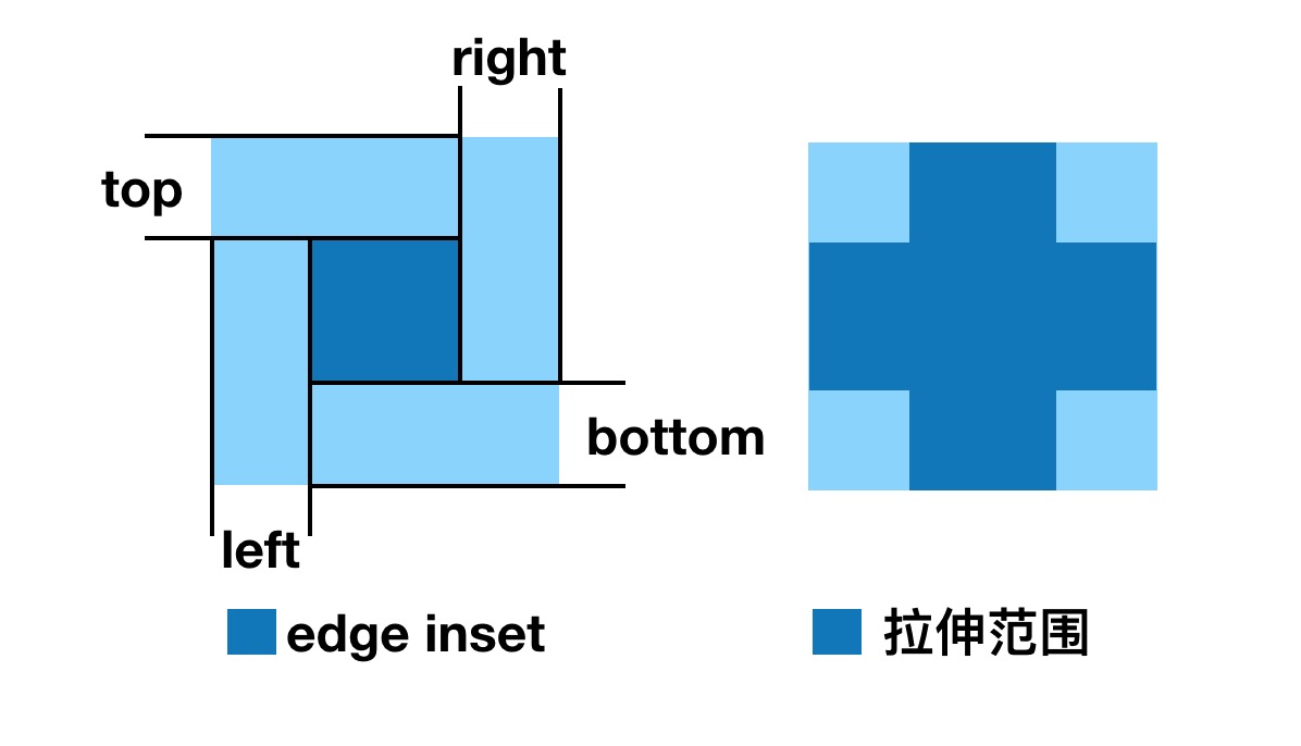 其中 UIEdgeInsetsMake 將創建并返回一個 edge inset。 edge inset 控制著拉伸圖片的位置,其四個參數按上左下右的順序,指明拉伸范圍距各個邊的距離,從下圖可以看出edge inset 的內容和作用,我們可以拉伸圖片的同時,保證四個角不會變形。
