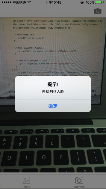 函數與之前實現的detect函數非常像,不過這次只用它來獲取圖像不做變換。當識別到人臉后顯示一個警告信息“檢測到了人臉!”,否則顯示“未檢測到人臉”。運行app測試一下: