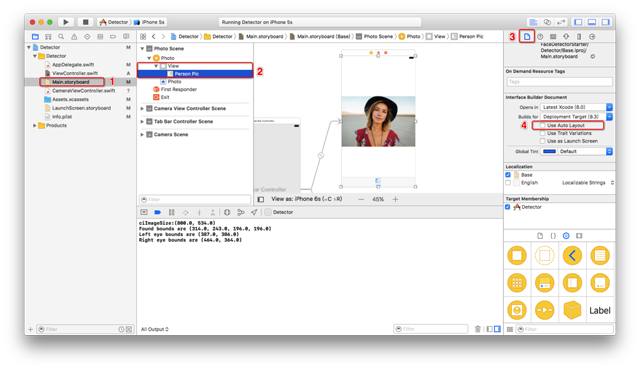 但是有的童鞋在使用了上面的代碼運行后可能會出現方框不存在(即沒有識別人臉)這種情況,這是由于忘記關閉Auto Layout以及Size Classes了。 選中storyBoard中的ViewController,選中view下的imageView。然后在右邊的面板中的第一個選項卡中找到use Auto Layout ,將前面的✔️去掉就可以了