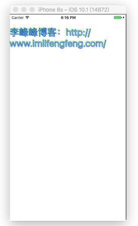 - (void)drawRect:(CGRect)rect { NSString *str = @"李峰峰博客:http://www.imlifengfeng.com/"; NSMutableDictionary *dict = [NSMutableDictionary dictionary]; //設(shè)置字體 dict[NSFontAttributeName] = [UIFont systemFontOfSize:30]; //設(shè)置顏色 dict[NSForegroundColorAttributeName] = [UIColor redColor]; //設(shè)置描邊 dict[NSStrokeColorAttributeName] = [UIColor blueColor]; dict[NSStrokeWidthAttributeName] = @3; //設(shè)置陰影 NSShadow *shadow = [[NSShadow alloc] init]; shadow.shadowColor = [UIColor greenColor]; shadow.shadowOffset = CGSizeMake(-2, -2); shadow.shadowBlurRadius = 3; dict[NSShadowAttributeName] = shadow; //設(shè)置文字的屬性 //drawAtPoint不會(huì)自動(dòng)換行 //[str drawAtPoint:CGPointMake(0, 0) withAttributes:dict]; //drawInRect會(huì)自動(dòng)換行 [str drawInRect:self.bounds withAttributes:dict]; }