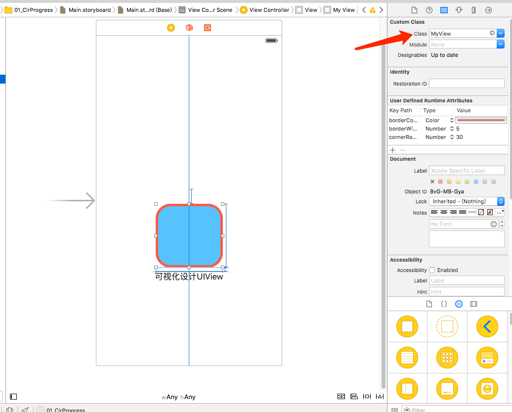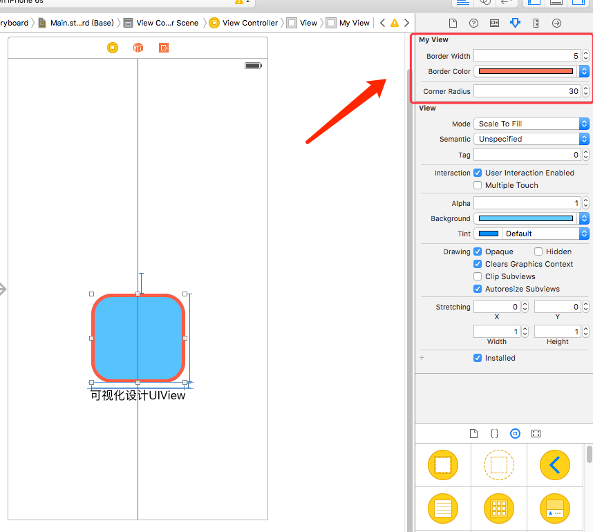 #import <UIKit/UIKit.h>// 設置類為可視化設計IB_DESIGNABLE@interface MyView : UIView// IBInspectable 為可視化設計屬性// 邊框寬度@property (nonatomic,assign)IBInspectable float borderWidth;// 邊框顏色@property (nonatomic,retain)IBInspectable UIColor* borderColor;// 圓角@property (nonatomic,assign)IBInspectable float cornerRadius;@end