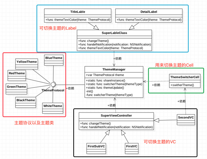 紅色框:下方類圖紅色框中就是我們的主題協議ThemeProtocol以及遵循該協議的所有主題。當然,依據“面向接口”編程的規則,外部所依賴的不是所有的主題類,而是主題協議ThemeProtocol。也就是ThemeManager類依賴于ThemeProtocol。而所有的主題類通過工廠類或者工廠方法間接的與ThemeManager。因為鑒于Swift中的枚舉中可以添加相應的計算屬性以及方法,所以我們可以使用相應的主題枚舉來充當這個工廠類,當然下方類圖中沒有給出,這個要看具體的代碼實現。