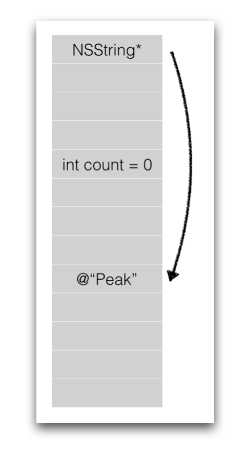 以64位系統為例,指針NSString*是8個字節的內存區域,int count是個4字節的區域,而@“Peak”是一塊根據字符串長度而定的內存區域。