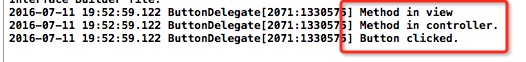 從日志可以看出,使controller成為view的代理,實現按鈕的代理方法,與按鈕相關的方法的執行順序為:view中按鈕的動作方法->controller提供的按鈕代理方法。