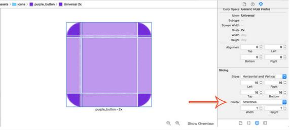 多虧了Xcode中Asset Catalog的slice和dice,我們不需要代碼也能拉伸圖片。首先在Xcode中選中圖片,然后點擊右下角的Show Slicing: