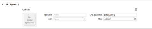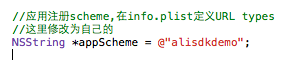 (2)點擊項目名稱,點擊“Info”選項卡,在“URL Types”選項中,點擊“+”,在“URL Schemes”中輸入自己的APP標示,如:“alisdkdemo”。“alisdkdemo”來自于以下代碼:
