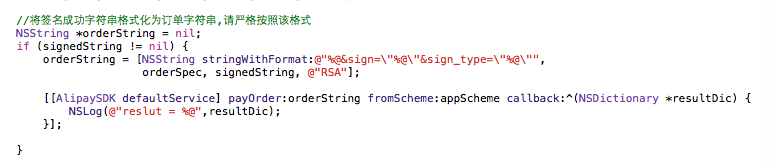 - (BOOL)application:(UIApplication *)app openURL:(NSURL *)url options:(NSDictionary<NSString*, id> *)options{ [[AlipaySDK defaultService] processOrderWithPaymentResult:url standbyCallback:^(NSDictionary *resultDic) { NSLog(@"result = %@",resultDic);//返回的支付結果 //【由于在跳轉支付寶客戶端支付的過程中,商戶app在后臺很可能被系統kill了,所以pay接口的callback就會失效,請商戶對standbyCallback返回的回調結果進行處理,就是在這個方法里面處理跟callback一樣的邏輯】 }]; return YES;}
