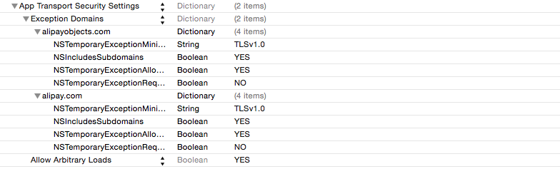 3、如果你的app基于9.0編譯,那么為了適配iOS9.0中的App Transport Security(ATS)對http的限制,這里需要對支付寶的請求地址alipay.com、alipayobjects.com做例外,在app對應的info.list中添加如下配置