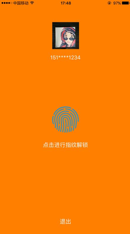 @interface YLSTouchidView()<WJTouchIDDelegate>/** 指紋解鎖的button */@property (nonatomic,strong) UIButton *touchIdBtn;/** 頭像 */@property (nonatomic,strong) UIImageView *iconView;/** 用戶名 */@property (nonatomic,strong) UILabel *nameLabel;/** 提示信息 */@property (nonatomic,strong) UILabel *noticeLabel;/** 手機號 */@property (nonatomic,strong) NSString *phoneNumber;/** 退出按鈕 */@property (nonatomic,strong) UIButton *quitBtn;@property (nonatomic, strong) WJTouchID *touchID;@end-(instancetype)initWithFrame:(CGRect)frame{ self = [super initWithFrame:YLSScreenBounds]; if (self) { self.backgroundColor = [UIColor orangeColor]; } //調用指紋解鎖 WJTouchID *touchid = [[WJTouchID alloc]init]; [touchid startWJTouchIDWithMessage:WJNotice(@"自定義信息", @"The Custom Message") fallbackTitle:WJNotice(@"", @"Fallback Title") delegate:self]; self.touchID = touchid; return self;}