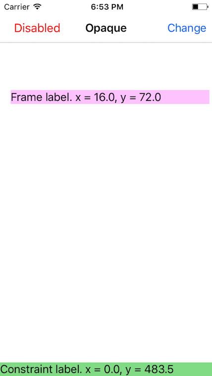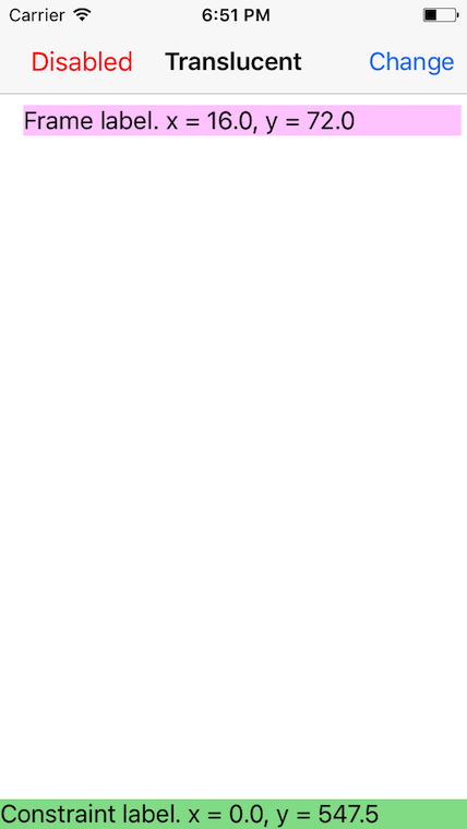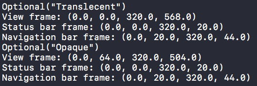 @objc private func rightButtonClicked(_ sender: AnyObject) {navigationController?.navigationBar.isTranslucent = !navigationController!.navigationBar.isTranslucent updateLabelContent()}private func updateLabelContent() { title = navigationController!.navigationBar.isTranslucent ? "Translecent" : "Opaque" let frameLabelOrigin = frameLabel.frame.origin frameLabel.text = "Frame label. x = /(frameLabelOrigin.x), y = /(frameLabelOrigin.y)" let constraintLabelOrigin = constraintLabel.frame.origin constraintLabel.text = "Constraint label. x = /(constraintLabelOrigin.x), y = /(constraintLabelOrigin.y)" print("/(title)") print("Status bar frame:", UIApplication.shared.statusBarFrame) // (0.0, 0.0, 375.0, 20.0) print("Navigation bar frame:", navigationController!.navigationBar.frame) // (0.0, 20.0, 375.0, 44.0)}