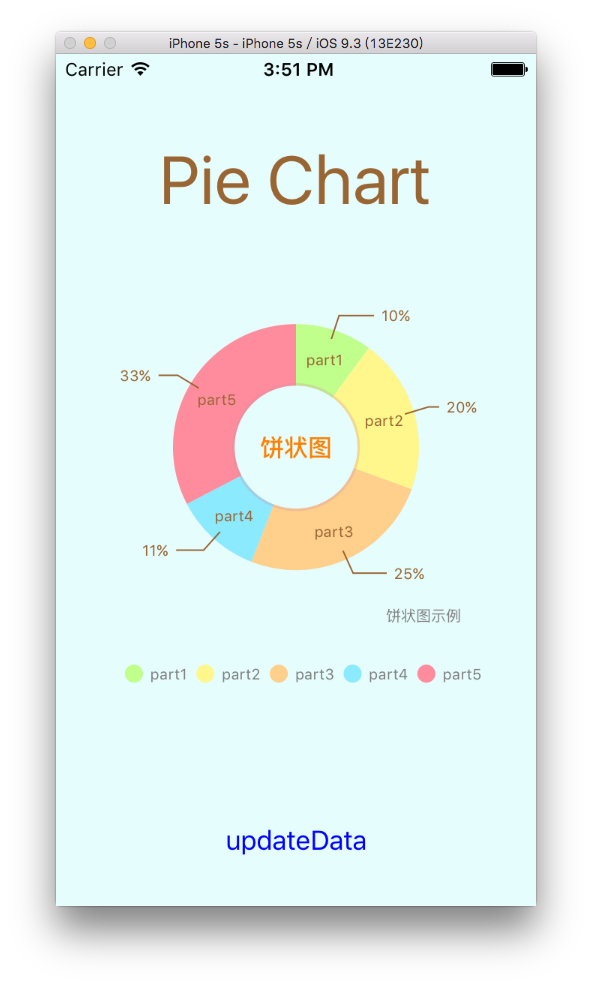 - (PieChartData *)setData{ double mult = 100; int count = 5;//餅狀圖總共有幾塊組成 //每個區塊的數據 NSMutableArray *yVals = [[NSMutableArray alloc] init]; for (int i = 0; i < count; i++) { double randomVal = arc4random_uniform(mult + 1); BarChartDataEntry *entry = [[BarChartDataEntry alloc] initWithValue:randomVal xIndex:i]; [yVals addObject:entry]; } //每個區塊的名稱或描述 NSMutableArray *xVals = [[NSMutableArray alloc] init]; for (int i = 0; i < count; i++) { NSString *title = [NSString stringWithFormat:@"part%d", i+1]; [xVals addObject:title]; } //dataSet PieChartDataSet *dataSet = [[PieChartDataSet alloc] initWithYVals:yVals label:@""]; dataSet.drawValuesEnabled = YES;//是否繪制顯示數據 NSMutableArray *colors = [[NSMutableArray alloc] init]; [colors addObjectsFromArray:ChartColorTemplates.vordiplom]; [colors addObjectsFromArray:ChartColorTemplates.joyful]; [colors addObjectsFromArray:ChartColorTemplates.colorful]; [colors addObjectsFromArray:ChartColorTemplates.liberty]; [colors addObjectsFromArray:ChartColorTemplates.pastel]; [colors addObject:[UIColor colorWithRed:51/255.f green:181/255.f blue:229/255.f alpha:1.f]]; dataSet.colors = colors;//區塊顏色 dataSet.sliceSpace = 0;//相鄰區塊之間的間距 dataSet.selectionShift = 8;//選中區塊時, 放大的半徑 dataSet.xValuePosition = PieChartValuePositionInsideSlice;//名稱位置 dataSet.yValuePosition = PieChartValuePositionOutsideSlice;//數據位置 //數據與區塊之間的用于指示的折線樣式 dataSet.valueLinePart1OffsetPercentage = 0.85;//折線中第一段起始位置相對于區塊的偏移量, 數值越大, 折線距離區塊越遠 dataSet.valueLinePart1Length = 0.5;//折線中第一段長度占比 dataSet.valueLinePart2Length = 0.4;//折線中第二段長度最大占比 dataSet.valueLineWidth = 1;//折線的粗細 dataSet.valueLineColor = [UIColor brownColor];//折線顏色 //data PieChartData *data = [[PieChartData alloc] initWithXVals:xVals dataSet:dataSet]; NSNumberFormatter *formatter = [[NSNumberFormatter alloc] init]; formatter.numberStyle = NSNumberFormatterPercentStyle; formatter.maximumFractionDigits = 0;//小數位數 formatter.multiplier = @1.f; [data setValueFormatter:formatter];//設置顯示數據格式 [data setValueTextColor:[UIColor brownColor]]; [data setValueFont:[UIFont systemFontOfSize:10]]; return data;}