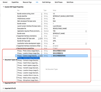 APP想要使用系統的某個權限,必須要在項目設置info.plist文件中設置相應的權限說明,否則在IOS10上會出現崩潰。