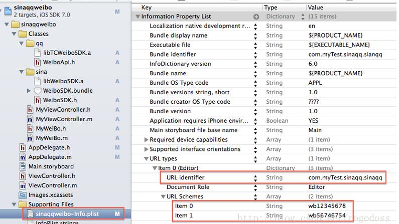 然后設置Info.plist文件的URL types鍵值,這個的作用是新浪客戶端或騰訊客戶端能回調到我們的程序來。他們通過一個bundle id 和這里設置的URL Schemes鍵值就會相應我們app的AppDelete中的 (BOOL)application:(UIApplication *)application openURL:(NSURL *)url sourceApplication:(NSString *)sourceApplication annotation:(id)annotation委托 函數。