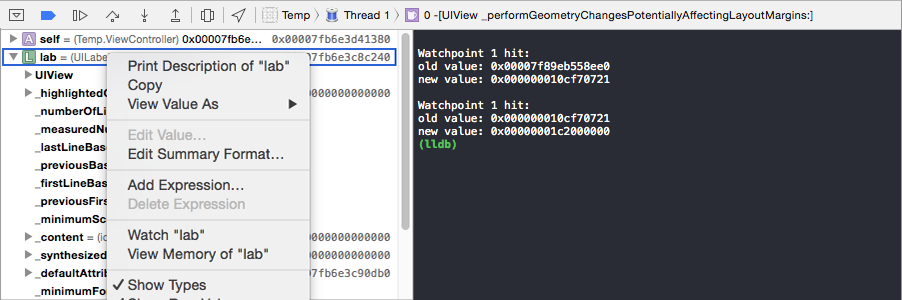 這里我監視了lab這個UILabel的變量,每當這個變量進行更新它的信息就會被打印到控制臺。