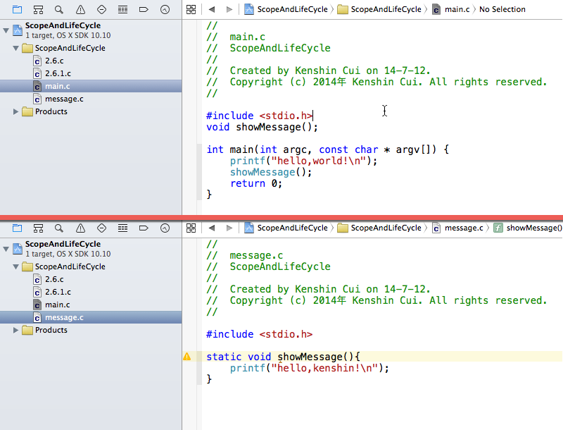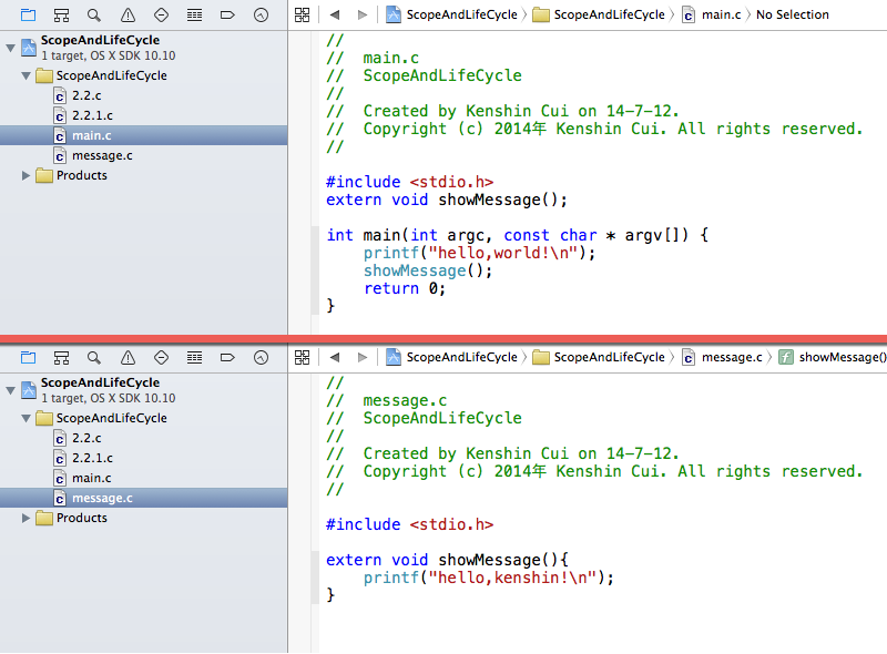 和作用于變量不同,上面main.c和message.c中的extern都可以省略,在這里extern的作用就是定義或聲明一個外部函數。從上面可以看到在不同的文件中可以定義同一個變量,它們被視為同一個變量,但是需要指出的是外部函數在一個程序中是不能重名的,否則會報錯。