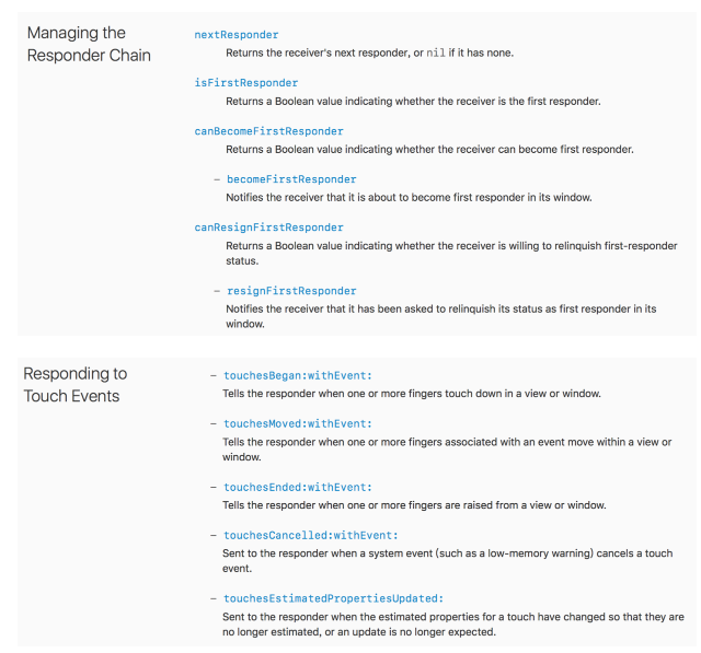 UIResponder的屬性和方法如下圖,其中nextResponder表示指向一個(gè)UIResponder對(duì)象。