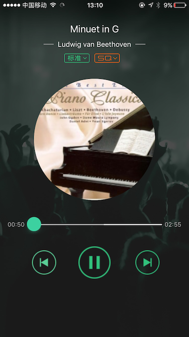 根據QQ音樂的界面做了個小demo,下面是demo的真機前臺和后臺播放的運行效果: