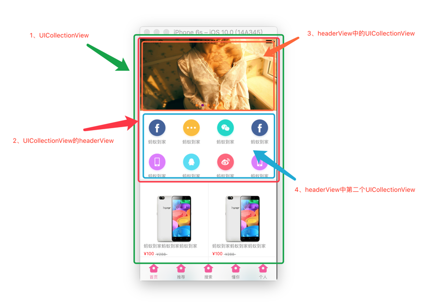 看下圖的層級關系,除去最下方的TabBar,首頁其余部分全是用UICollectionView實現;其分兩大部分,實現三種功能。上方是父UICollectionView的headerView,在此headerView中添加了兩個UICollectionView,分別實現圖片無限輪播器和一個橫向滑動的功能菜單按鈕。然后下面就是父UICollectionView的cell,上下滑動展示商品內容。