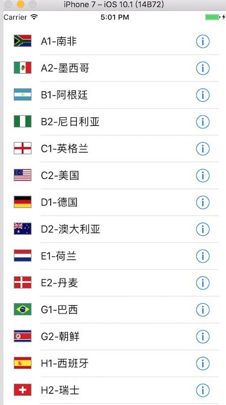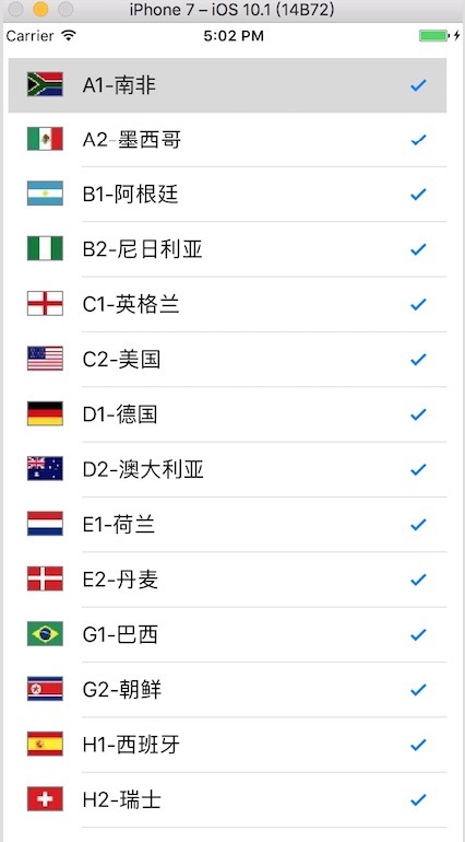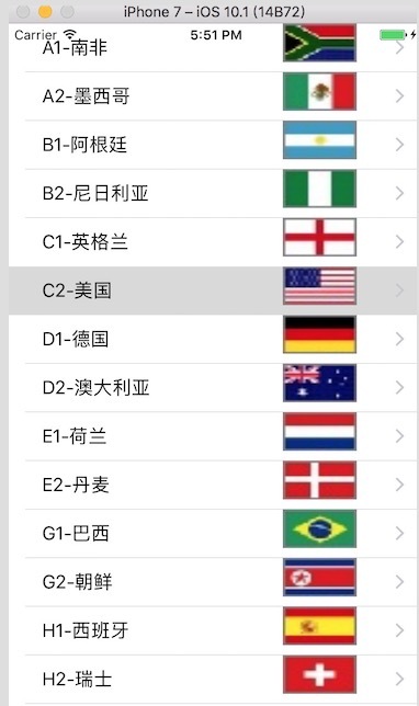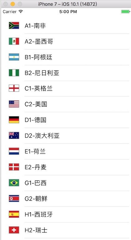 //// ViewController.swift// SimpleTableView//// Created by Michael on 2016/10/24.// Copyright © 2016年 Michael. All rights reserved.//import UIKitclass ViewController: UITableViewController { var listItems: NSArray! override func viewDidLoad() { super.viewDidLoad() // Do any additional setup after loading the view, typically from a nib. let listPath = Bundle.main.path(forResource: "team", ofType: "plist") self.listItems = NSArray(contentsOfFile: listPath!) } override func didReceiveMemoryWarning() { super.didReceiveMemoryWarning() // Dispose of any resources that can be recreated. } override func tableView(_ tableView: UITableView, numberOfRowsInSection section: Int) -> Int { return self.listItems.count } override func tableView(_ tableView: UITableView, cellForRowAt indexPath: IndexPath) -> UITableViewCell { //找到自定義單元格 let cell:CustomCell! = tableView.dequeueReusableCell(withIdentifier: "CustomCellId", for: indexPath) as? CustomCell //let cell = UITableViewCell(style: .value1, reuseIdentifier: "CellIdentifier") let row = indexPath.row let rowDict = self.listItems[row] as! NSDictionary //設置控件屬性 cell.mLabel.text = rowDict["name"] as? String let imagePath = String(format: "%@.png", rowDict["image"] as! String) cell.mImage.image = UIImage(named: imagePath) cell.accessoryType = .disclosureIndicator return cell }}