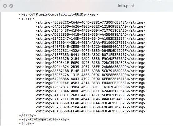 從上圖可以看到DVTPlugInCompatibilityUUIDs數組,這個數組包含了插件所兼容的Xcode的DVTPlugInCompatibilityUUID列表,每個版本的Xcode的DVTPlugInCompatibilityUUID 都是不同的,Xcode更新之后,插件并不會自動更新這個數組,導致插件失效,所以我們把最新版Xcode的DVTPlugInCompatibilityUUID添加進這個數組即可。