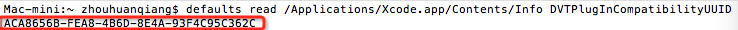 defaults read /Applications/Xcode.app/Contents/Info DVTPlugInCompatibilityUUID