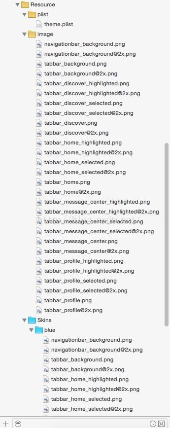 <span style="font-weight: normal;"><span style="font-weight: normal;">#import <Foundation/Foundation.h> #import <UIKit/UIKit.h> @interface ThemeManager : NSObject @property (nonatomic, copy) NSString * themeName; // 主題名字 @property (nonatomic, retain) NSDictionary * themePlistDict; // 主題屬性列表字典 + (ThemeManager *) sharedThemeManager; - (UIImage *) themeImageWithName:(NSString *)imageName; @end #import "ThemeManager.h" #import "NotificationMacro.h" static ThemeManager * sharedThemeManager; @implementation ThemeManager - (id) init { if(self = [super init]) { NSString * themePath = [[NSBundle mainBundle] pathForResource:@"theme" ofType:@"plist"]; self.themePlistDict = [NSDictionary dictionaryWithContentsOfFile:themePath]; self.themeName = nil; } return self; } + (ThemeManager *) sharedThemeManager { @synchronized(self) { if (nil == sharedThemeManager) { sharedThemeManager = [[ThemeManager alloc] init]; } } return sharedThemeManager; } // Override 重寫themeName的set方法 - (void) setThemeName:(NSString *)themeName { _themeName = themeName; } - (UIImage *) themeImageWithName:(NSString *)imageName { if (imageName == nil) { return nil; } NSString * themePath = [self themePath]; NSString * themeImagePath = [themePath stringByAppendingPathComponent:imageName]; UIImage * themeImage = [UIImage imageWithContentsOfFile:themeImagePath]; return themeImage; } // 返回主題路徑 - (NSString *)themePath { NSString * resourcePath = [[NSBundle mainBundle] resourcePath]; if (self.themeName == nil || [self.themeName isEqualToString:@""]) { return resourcePath; } NSString * themeSubPath = [self.themePlistDict objectForKey:self.themeName]; // Skins/blue NSString * themeFilePath = [resourcePath stringByAppendingPathComponent:themeSubPath]; // .../Skins/blue return themeFilePath; } @end