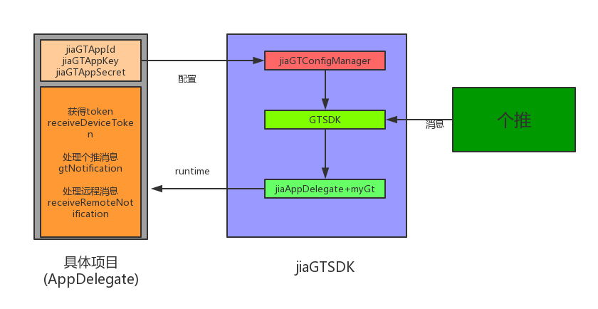 消息推送對(duì)于一個(gè)APP是相當(dāng)重要性,一般是采用第三方的SDK進(jìn)行集成,其實(shí)大部分的SDK處理代碼都是差不多,在這實(shí)例中對(duì)差異化的內(nèi)容進(jìn)行提取,實(shí)例中將以個(gè)推進(jìn)行模塊化,因?yàn)橄⑼扑偷拇蟛糠执a都集中在AppDelegate中,造成的一大堆雜亂代碼,當(dāng)然也有一部分人對(duì)AppDelegate進(jìn)行擴(kuò)展分類進(jìn)行移除代碼,實(shí)例中將采用另外一種解決方案進(jìn)行抽取,可以達(dá)到完全解耦,在具體的APP里面將不會(huì)再出現(xiàn)個(gè)推SDK相關(guān)內(nèi)容,只要簡單進(jìn)行配置跟處理消息就可以,下面只是簡單的列出部分代碼,其它封裝代碼見源代碼;