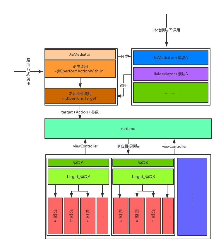 JiaMediator起到一個(gè)中介的作用,所有的模塊間響應(yīng)交互都是通過它進(jìn)行,每個(gè)模塊都會(huì)對(duì)它進(jìn)行擴(kuò)展分類(例如:JiaMediator+模塊A),分類主要是為了用于本地間調(diào)用而又不想用路由的方式,若要用路由的方式則要注意關(guān)于路由約束準(zhǔn)確編寫,它將會(huì)直接影響到能否正確響應(yīng)到目標(biāo);實(shí)例中也有關(guān)于使用通知的方式進(jìn)行回調(diào)參數(shù)的回傳問題;