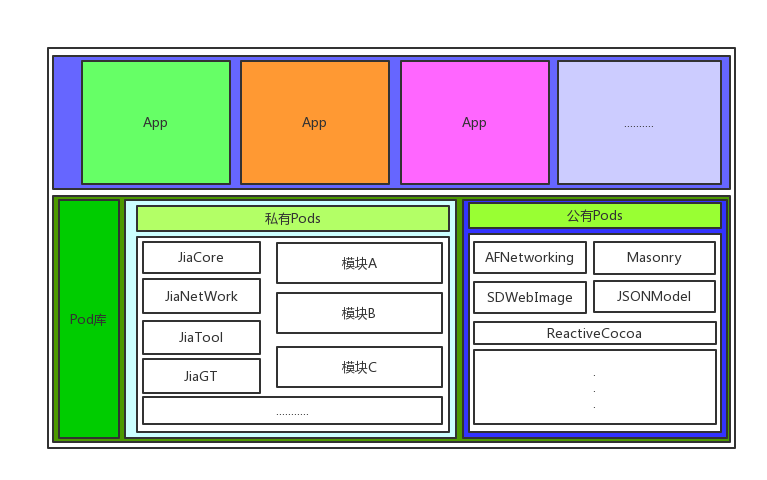 1:當(dāng)公司里面有多個(gè)項(xiàng)目同時(shí)進(jìn)行,并且有可能是多個(gè)人分別不同項(xiàng)目時(shí),就會(huì)存在如上圖出現(xiàn)的情況,其實(shí)每個(gè)APP中都是有很多共同的模塊,當(dāng)然有可能你會(huì)把相同功能模塊代碼復(fù)制一份在新項(xiàng)目中,但這其實(shí)并不是最好的方式,在后期不斷迭代過程中,不同的人會(huì)往里面增加很多帶有個(gè)人色彩的代碼;這樣就像相同的模塊項(xiàng)目后期對(duì)于多個(gè)項(xiàng)目統(tǒng)一管理也是災(zāi)難性,有可能會(huì)失控,哪怕項(xiàng)目轉(zhuǎn)移別人接手也會(huì)無形中浪費(fèi)很多時(shí)間,增加維護(hù)成本,所以實(shí)例中更注重對(duì)于一些相同模塊進(jìn)行提取,求同存異;而模塊化結(jié)合私有Pods進(jìn)行管理,對(duì)于常用功能的封裝,只要開放出一些簡單開關(guān)配置方式,就可以實(shí)現(xiàn)一個(gè)功能,比如日志記錄、網(wǎng)絡(luò)請(qǐng)求模塊、網(wǎng)絡(luò)狀態(tài)變化提示等;