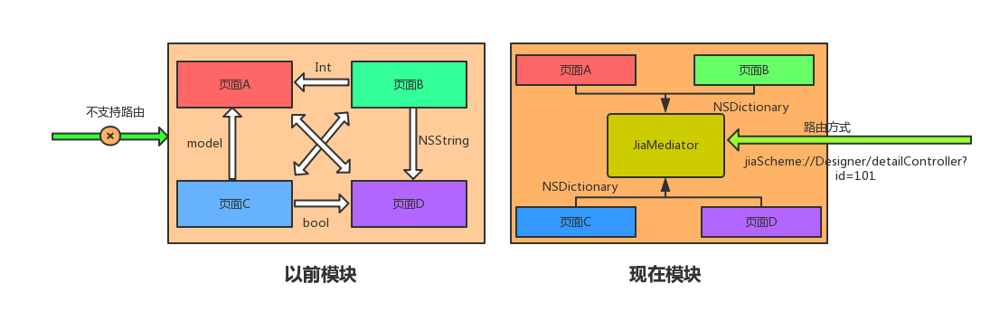2:對(duì)于頁面之間相互耦合,而頁面之間的傳參也各不相同,由于不同的開發(fā)人員或者簡便方式等原因,傳參的類型都有差異,包含如實(shí)體、簡單基本類型等,先前項(xiàng)目對(duì)于路由方式也不支持,導(dǎo)致要實(shí)現(xiàn)收到消息推送進(jìn)行不同的頁面跳轉(zhuǎn)存在硬編碼情況,對(duì)于功能擴(kuò)展存在相當(dāng)大的問題;而右邊則是模塊化后頁面之間的交互方式;頁面之間也不存在耦合關(guān)系,都只跟JiaMediator這個(gè)中介者相依賴;而傳參都統(tǒng)一成以字典的形式;雖然可能犧牲一些方便跟隨意,卻可以解耦模塊化;并且加入對(duì)路由方式的處理;約定好相關(guān)的協(xié)議進(jìn)行交互;用這種路由方式代替那些第三方的路由插件則是因?yàn)樗撵`活性,最主要還是省去了第三方路由插件在啟動(dòng)時(shí)要注冊(cè)路由的問題;