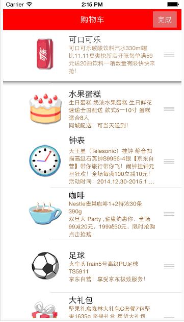 // ViewController.m// JRTableView刪除//// Created by jerehedu on 15/6/11.// Copyright (c) 2015年 jerehedu. All rights reserved.//#import "ViewController.h"#import "Goods.h"@interface ViewController ()<UITableViewDataSource, UITableViewDelegate>{ UITableView *_tableView; //列表 NSMutableArray *_goodsAry; //商品數組 UIButton *_editBtn; //編輯按鈕}@end@implementation ViewController- (void)viewDidLoad { [super viewDidLoad]; //添加標題 UILabel *titleLabel = [[UILabel alloc] initWithFrame:CGRectMake(0, 20, self.view.frame.size.width, 44)]; titleLabel.text = @"購物車"; titleLabel.textAlignment = NSTextAlignmentCenter; titleLabel.backgroundColor = [UIColor redColor]; titleLabel.textColor = [UIColor whiteColor]; [self.view addSubview:titleLabel]; //添加編輯按鈕 _editBtn = [UIButton buttonWithType:UIButtonTypeCustom]; _editBtn.frame = CGRectMake(self.view.frame.size.width-60, 25, 50, 34); [_editBtn setTitle:@"編輯" forState:UIControlStateNormal]; [_editBtn setTitle:@"完成" forState:UIControlStateSelected]; _editBtn.titleLabel.font = [UIFont systemFontOfSize:15]; _editBtn.backgroundColor = [UIColor colorWithRed:0.8 green:0.8 blue:0.8 alpha:0.5]; [self.view addSubview:_editBtn]; [_editBtn addTarget:self action:@selector(clickEditBtn:) forControlEvents:UIControlEventTouchUpInside]; //添加tableview _tableView = [[UITableView alloc] initWithFrame:CGRectMake(0, 64, self.view.frame.size.width, self.view.frame.size.height-64)]; _tableView.dataSource = self; _tableView.delegate = self; [self.view addSubview:_tableView]; //取數據 NSArray *ary = [NSArray arrayWithContentsOfFile:[[NSBundle mainBundle] pathForResource:@"ShoppingGoodsList" ofType:@"plist"]]; //把數據存到模型對象中,然后把對象存到數組中 _goodsAry = [NSMutableArray array]; for (int i=0; i<ary.count; i++) { Goods *good = [Goods goodsWithDic:ary[i]]; [_goodsAry addObject:good]; }}#pragma mark 數據源 返回有幾行-(NSInteger)tableView:(UITableView *)tableView numberOfRowsInSection:(NSInteger)section{ return _goodsAry.count;}#pragma mark 每行顯示內容-(UITableViewCell*)tableView:(UITableView *)tableView cellForRowAtIndexPath:(NSIndexPath *)indexPath{ static NSString *idGood = @"goods"; UITableViewCell *cell = [tableView dequeueReusableCellWithIdentifier:idGood]; if (cell==nil) { cell = [[UITableViewCell alloc] initWithStyle:UITableViewCellStyleSubtitle reuseIdentifier:idGood]; } Goods *good = _goodsAry[indexPath.row]; cell.imageView.image = [UIImage imageNamed:good.icon]; cell.textLabel.text = good.name; cell.detailTextLabel.text = good.details; cell.detailTextLabel.numberOfLines = 6; cell.detailTextLabel.textColor = [UIColor brownColor]; return cell;}#pragma mark 選中行-(void)tableView:(UITableView *)tableView didSelectRowAtIndexPath:(NSIndexPath *)indexPath{ // 取消選中狀態 [tableView deselectRowAtIndexPath:indexPath animated:YES];}#pragma mark 設置行高-(CGFloat)tableView:(UITableView *)tableView heightForRowAtIndexPath:(NSIndexPath *)indexPath{ return 110;}#pragma mark 點擊編輯按鈕- (IBAction)clickEditBtn:(UIButton *)sender { //設置tableview編輯狀態 BOOL flag = !_tableView.editing; [_tableView setEditing:flag animated:YES]; _editBtn.selected = flag;}#pragma mark 選擇編輯模式,添加模式很少用,默認是刪除-(UITableViewCellEditingStyle)tableView:(UITableView *)tableView editingStyleForRowAtIndexPath:(NSIndexPath *)indexPath{ return UITableViewCellEditingStyleNone;}#pragma mark 排序 當移動了某一行時候會調用//編輯狀態下,只要實現這個方法,就能實現拖動排序-(void)tableView:(UITableView *)tableView moveRowAtIndexPath:(NSIndexPath *)sourceIndexPath toIndexPath:(NSIndexPath *)destinationIndexPath{ // 取出要拖動的模型數據 Goods *goods = _goodsAry[sourceIndexPath.row]; //刪除之前行的數據 [_goodsAry removeObject:goods]; // 插入數據到新的位置 [_goodsAry insertObject:goods atIndex:destinationIndexPath.row];}@end