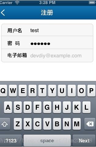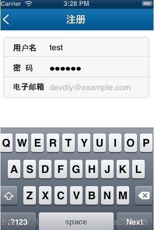 //創(chuàng)建輸入框- (void)addInputOne{ //基本參數(shù)定義 CGFloat padx = 95.0f; _vFrame = CGRectMake(10, 14, 300, 125); UIFont *lpFont = [UIFont boldSystemFontOfSize:16]; //郵箱和密碼背景顏色設(shè)置 _view = [[UIView alloc] initWithFrame:_vFrame]; _view.layer.cornerRadius = 8.0; _view.layer.borderWidth = 1; _view.layer.borderColor = [UIColor colorWithRed:209.0f/255.0f green:209.0f/255.0f blue:209.0f/255.0f alpha:1.0f].CGColor; [_view setBackgroundColor:[UIColor colorWithRed:247.0f/255.0f green:247.0f/255.0f blue:247.0f/255.0f alpha:1.0f]]; [self.view addSubview:_view]; [_view release]; //用戶名與密碼中間分割線 UIView *lineOne = [[UIView alloc] initWithFrame:CGRectMake(10, 53, 300, 1)]; [lineOne setBackgroundColor:[UIColor colorWithRed:209.0f/255.0f green:209.0f/255.0f blue:209.0f/255.0f alpha:1.0f]]; [self.view addSubview:lineOne]; [lineOne release]; //用戶名 UILabel *_unameLab = [[UILabel alloc] initWithFrame:CGRectMake(20, 2, 55, 40)]; [_unameLab setText:@"用戶名"]; _unameLab.highlighted = YES; _unameLab.highlightedTextColor = [UIColor blackColor]; [_unameLab setFont:lpFont]; [_unameLab setBackgroundColor:[UIColor clearColor]]; [_unameLab setTextColor:[UIColor blackColor]]; [_view addSubview:_unameLab]; [_unameLab release]; _uname = [[UITextField alloc] initWithFrame:CGRectMake(padx, 10, 230, 40)]; [_uname setBackgroundColor:[UIColor clearColor]]; [_uname setTag:101]; [_uname setUserInteractionEnabled:YES]; [_uname setKeyboardType:UIKeyboardTypeDefault]; [_uname setReturnKeyType:UIReturnKeyNext]; //鍵盤下一步Next [_uname setAutocapitalizationType:UITextAutocapitalizationTypeNone]; //關(guān)閉首字母大寫 [_uname setAutocorrectionType:UITextAutocorrectionTypeNo]; [_uname setReturnKeyType:UIReturnKeyNext]; //下一個Passwd [_uname becomeFirstResponder]; //默認(rèn)打開鍵盤 [_uname setFont:[UIFont systemFontOfSize:17]]; [_uname setDelegate:self]; [_uname setText:@""]; [_uname setHighlighted:YES]; [_view addSubview:_uname]; //密碼 UILabel *_passwdLab = [[UILabel alloc] initWithFrame:CGRectMake(20, 43, 45, 40)]; [_passwdLab setText:@"密 碼"]; [_passwdLab setFont:lpFont]; _passwdLab.highlighted = YES; _passwdLab.highlightedTextColor = [UIColor blackColor]; [_passwdLab setBackgroundColor:[UIColor clearColor]]; [_passwdLab setTextColor:[UIColor blackColor]]; [_view addSubview:_passwdLab]; [_passwdLab release]; _passwd = [[UITextField alloc] initWithFrame:CGRectMake(padx, 53, 200, 40)]; [_passwd setBackgroundColor:[UIColor clearColor]]; [_passwd setKeyboardType:UIKeyboardTypeDefault]; [_passwd setBorderStyle:UITextBorderStyleNone]; [_passwd setAutocapitalizationType:UITextAutocapitalizationTypeNone]; //關(guān)閉首字母大寫 [_passwd setReturnKeyType:UIReturnKeyNext]; //下一個Email [_passwd setSecureTextEntry:YES]; //驗(yàn)證 [_passwd setDelegate:self]; [_passwd setTag:102]; [_passwd setTextColor:[UIColor grayColor]]; [_passwd setFont:lpFont]; [_passwd setText:@""]; [_view addSubview:_passwd]; //郵箱與密碼中間分割線 UIView *lineTow = [[UIView alloc] initWithFrame:CGRectMake(10, 95, 300, 1)]; [lineTow setBackgroundColor:[UIColor colorWithRed:209.0f/255.0f green:209.0f/255.0f blue:209.0f/255.0f alpha:1.0f]]; [self.view addSubview:lineTow]; [lineTow release]; //用戶郵箱 UILabel *_emailLab = [[UILabel alloc] initWithFrame:CGRectMake(20, 82, 280, 40)]; [_emailLab setText:@"電子郵箱"]; _emailLab.highlighted = YES; _emailLab.highlightedTextColor = [UIColor blackColor]; [_emailLab setFont:lpFont]; [_emailLab setBackgroundColor:[UIColor clearColor]]; [_emailLab setTextColor:[UIColor blackColor]]; [_view addSubview:_emailLab]; [_emailLab release]; _email = [[UITextField alloc] initWithFrame:CGRectMake(padx, 92, 200, 40)]; [_email setBackgroundColor:[UIColor clearColor]]; [_email setKeyboardType:UIKeyboardTypeEmailAddress]; [_email setTextColor:[UIColor grayColor]]; [_email setTag:103]; [_email setReturnKeyType:UIReturnKeyDone]; //鍵盤下一步Next [_email setAutocapitalizationType:UITextAutocapitalizationTypeNone]; //關(guān)閉首字母大寫 [_email setAutocorrectionType:UITextAutocorrectionTypeNo]; [_email setFont:[UIFont systemFontOfSize:17]]; [_email setDelegate:self]; [_email setPlaceholder:@"devdiy@example.com"]; [_email setText:@""]; [_email setHighlighted:YES]; [_view addSubview:_email];}