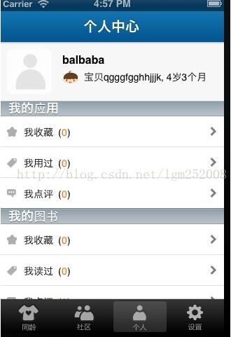 #pragma mark addHeadView- (void)addHeadView{ //頭像背景設(shè)置 UIView *headView = [[UIView alloc] initWithFrame:CGRectMake(0, 0, 320, 84)]; [headView setBackgroundColor:[UIColor colorWithRed:247.0f/255.0f green:247.0f/255.0f blue:247.0f/255.0f alpha:1.0f]]; //按鈕方式添加左側(cè)用頭像 UIButton *headBtn = [[UIButton alloc] initWithFrame:CGRectMake(10, 10, 64, 64)]; [headBtn setBackgroundImage:[UIImage imageNamed:@"Baby_head.png"] forState:UIControlStateNormal]; headBtn.layer.cornerRadius = 8.0; headBtn.layer.masksToBounds = YES; [headView addSubview:headBtn]; [headBtn release]; [self.view addSubview:headView]; //用戶名 UILabel *unameLab = [[UILabel alloc] initWithFrame:CGRectMake(89, 15, 200, 20)]; [unameLab setText:@"balbaba"]; [unameLab setTextColor:[UIColor blackColor]]; [unameLab setFont:[UIFont boldSystemFontOfSize:16]]; [unameLab setBackgroundColor:[UIColor clearColor]]; [headView addSubview:unameLab]; //寶貝頭像小圖 UIImageView *iconView = [[UIImageView alloc] initWithFrame:CGRectMake(89, 38, 24, 24)]; [iconView setImage:[UIImage imageNamed:@"Baby_gender_boy.png"]]; [headView addSubview:iconView]; //寶貝昵稱 UILabel *nicknameLab = [[UILabel alloc] initWithFrame:CGRectMake(120, 40, 120, 20)]; [nicknameLab setText:@"寶貝qgggfgghhjjjk"]; [nicknameLab setTextColor:[UIColor blackColor]]; [nicknameLab setFont:[UIFont systemFontOfSize:14]]; [nicknameLab setBackgroundColor:[UIColor clearColor]]; [headView addSubview:nicknameLab]; //寶貝生日 UILabel *birthDayLab = [[UILabel alloc] initWithFrame:CGRectMake(230, 40, 80, 20)]; [birthDayLab setText:@", 4歲3個月"]; [birthDayLab setTextColor:[UIColor blackColor]]; [birthDayLab setFont:[UIFont systemFontOfSize:14]]; [birthDayLab setBackgroundColor:[UIColor clearColor]]; [headView addSubview:birthDayLab]; [headView release];}
