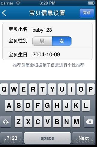 //創(chuàng)建輸入框- (void)addInputTow{ //基本參數(shù)定義 CGFloat padx = 100.0f; _vFrame = CGRectMake(10, 10, 300, 125); UIFont *lpFont = [UIFont boldSystemFontOfSize:16]; //寶貝小名、寶貝性別、寶貝生日背景顏色設(shè)置 _view = [[UIView alloc] initWithFrame:_vFrame]; _view.layer.cornerRadius = 8.0; _view.layer.borderWidth = 1; _view.layer.borderColor = [UIColor colorWithRed:209.0f/255.0f green:209.0f/255.0f blue:209.0f/255.0f alpha:1.0f].CGColor; [_view setBackgroundColor:[UIColor colorWithRed:247.0f/255.0f green:247.0f/255.0f blue:247.0f/255.0f alpha:1.0f]]; [self.view addSubview:_view]; [_view release]; //寶貝小名和寶貝性別分割線 UIView *lineOne = [[UIView alloc] initWithFrame:CGRectMake(10, 10, 300, 1)]; [lineOne setBackgroundColor:[UIColor colorWithRed:209.0f/255.0f green:209.0f/255.0f blue:209.0f/255.0f alpha:1.0f]]; [self.view addSubview:lineOne]; [lineOne release]; //寶貝小名 UILabel *_nicknameLab = [[UILabel alloc] initWithFrame:CGRectMake(20, 2, 75, 40)]; [_nicknameLab setText:@"寶貝小名"]; _nicknameLab.highlighted = YES; _nicknameLab.highlightedTextColor = [UIColor blackColor]; [_nicknameLab setFont:lpFont]; [_nicknameLab setBackgroundColor:[UIColor clearColor]]; [_nicknameLab setTextColor:[UIColor blackColor]]; [_view addSubview:_nicknameLab]; [_nicknameLab release]; _nickname = [[UITextField alloc] initWithFrame:CGRectMake(padx, 13, 180, 40)]; [_nickname setBackgroundColor:[UIColor clearColor]]; [_nickname setTag:101]; [_nickname setUserInteractionEnabled:YES]; [_nickname setKeyboardType:UIKeyboardTypeDefault]; [_nickname setReturnKeyType:UIReturnKeyNext]; //鍵盤下一步Next [_nickname setAutocapitalizationType:UITextAutocapitalizationTypeNone]; //關(guān)閉首字母大寫 [_nickname setAutocorrectionType:UITextAutocorrectionTypeNo]; [_nickname setReturnKeyType:UIReturnKeyNext]; //下一個寶貝性別 [_nickname becomeFirstResponder]; //默認(rèn)打開鍵盤 [_nickname setFont:[UIFont systemFontOfSize:17]]; [_nickname setDelegate:self]; [_nickname setText:@""]; [_nickname setHighlighted:YES]; [_view addSubview:_nickname]; //寶貝性別 UILabel *_sexLab = [[UILabel alloc] initWithFrame:CGRectMake(20, 35, 75, 50)]; [_sexLab setText:@"寶貝性別"]; [_sexLab setFont:lpFont]; _sexLab.highlighted = YES; _sexLab.highlightedTextColor = [UIColor blackColor]; [_sexLab setBackgroundColor:[UIColor clearColor]]; [_sexLab setTextColor:[UIColor blackColor]]; [_view addSubview:_sexLab]; [_sexLab release]; _segment = [[UISegmentedControl alloc] initWithItems: [NSArray arrayWithObjects: @"男",@"女", nil]]; _segment.frame = CGRectMake(padx+10, 56, 130, 32); _segment.segmentedControlStyle = UISegmentedControlStylePlain; _segment.selectedSegmentIndex = 1; [self.view addSubview:_segment]; [_segment release]; //寶貝性別與寶貝生日中間分割線 UIView *lineTow = [[UIView alloc] initWithFrame:CGRectMake(10, 93, 300, 1)]; [lineTow setBackgroundColor:[UIColor colorWithRed:209.0f/255.0f green:209.0f/255.0f blue:209.0f/255.0f alpha:1.0f]]; [self.view addSubview:lineTow]; [lineTow release]; //寶貝生日 UILabel *_birthLab = [[UILabel alloc] initWithFrame:CGRectMake(30, 96, 75, 40)]; [_birthLab setText:@"寶貝生日"]; _birthLab.highlighted = YES; _birthLab.highlightedTextColor = [UIColor blackColor]; [_birthLab setFont:lpFont]; [_birthLab setBackgroundColor:[UIColor clearColor]]; [_birthLab setTextColor:[UIColor blackColor]]; [self.view addSubview:_birthLab]; [_birthLab release]; _birthDay = [[UIButton alloc] initWithFrame:CGRectMake(57, 96, 200, 40)]; [_birthDay setBackgroundColor:[UIColor clearColor]]; [_birthDay setTitleColor:[UIColor blackColor] forState:UIControlStateNormal]; [_birthDay setTitle:@"2004-10-09" forState:UIControlStateNormal]; [_birthDay setTag:104]; [_birthDay addTarget:self action:@selector(openBirthday) forControlEvents:UIControlEventTouchUpInside]; [_birthDay setHighlighted:YES]; [self.view addSubview:_birthDay]; //寶貝信息提示 UILabel *_babyNote = [[UILabel alloc] initWithFrame:CGRectMake(45, 131, 300, 40)]; [_babyNote setBackgroundColor:[UIColor clearColor]]; [_babyNote setTextColor:[UIColor colorWithRed:83.0f/255.0f green:92.0f/255.0f blue:112.0f/255.0f alpha:1.0f]]; [_babyNote setTag:104]; [_babyNote setFont:[UIFont systemFontOfSize:14]]; [_babyNote setText:@"推薦引擎會根據(jù)孩子信息進(jìn)行個性推薦"]; [_babyNote setHighlighted:YES]; [self.view addSubview:_babyNote]; [_babyNote release]; //初始日期選擇控件 _datePicker = [[UIDatePicker alloc] initWithFrame:CGRectMake(0.0, 200.0, 0.0, 0.0)]; NSDateFormatter *dateFormatter = [[NSDateFormatter alloc] init]; [dateFormatter setDateFormat:@"yyyy-MM-dd"]; //將當(dāng)前生日時間設(shè)置到日期輪軸上 _datePicker.date = [dateFormatter dateFromString:_birthDay.titleLabel.text]; //設(shè)置為中文顯示 NSLocale *locale = [[NSLocale alloc] initWithLocaleIdentifier:@"zh_CN"]; _datePicker.locale = locale; [locale release]; [_datePicker setDatePickerMode:UIDatePickerModeDate]; [_datePicker addTarget:self action:@selector(dataValueChanged) forControlEvents:UIControlEventValueChanged]; [self.view addSubview:_datePicker];}
