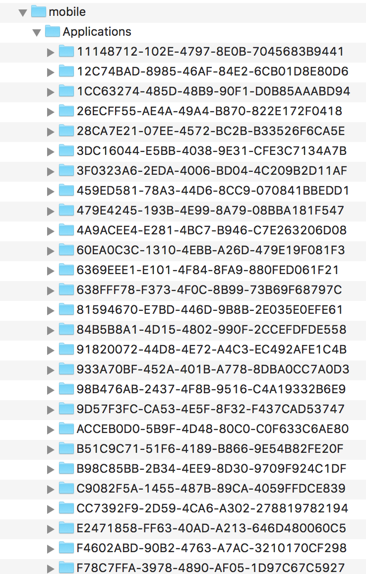 接下來(lái)就是要在越獄手機(jī)上尋找要“砸殼”的app路徑了,首先使用ssh連接到你的越獄設(shè)備,然后在越獄設(shè)備中打開(kāi)你要砸殼的App, 此處我們以微信為例。從AippStore中下載安裝的應(yīng)用都會(huì)位于/var/mobile/Applications中,下方的截圖就是我手機(jī)上從AppStore中下載的應(yīng)用的安裝路徑。當(dāng)然,下方是使用iExplore工具進(jìn)行查看的,下方內(nèi)容中,文件的拷貝我們都會(huì)用到iExplorer,當(dāng)然你也可以使用之前提到過(guò)的iFunBox。