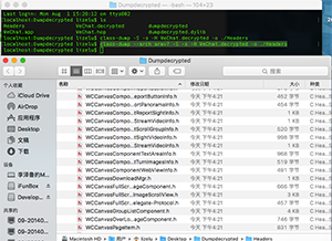 將上面生成的WeChat.decrypted脫殼文件拷貝的我們的Mac上,接下來(lái)就是我們class-dump出廠的時(shí)刻了。接下來(lái)我們要使用class-dump導(dǎo)出該脫殼文件的所有頭文件。具體步驟如下所示。