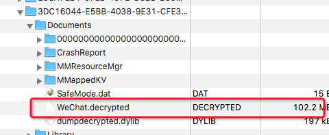 砸殼過(guò)程完成后,會(huì)在我們的Document目錄下生成一個(gè)WeChat.decrypted文件,如下截圖所示。該文件就是脫殼后的文件,我們可以將該文件拷貝到我們的Mac上,以備使用。