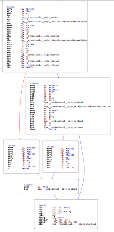 Hopper的功能是非常強(qiáng)大的,在Hopper中你可以對(duì)ARM指令進(jìn)行修改,并且生成一個(gè)新的可執(zhí)行文件。當(dāng)然Hopper強(qiáng)大的功能可以幫助你更好的理解ARM匯編語(yǔ)言的業(yè)務(wù)邏輯,Hopper會(huì)根據(jù)ARM匯編生成相關(guān)的邏輯圖,如下所示。從下方的邏輯圖中你就能清楚的看到相關(guān)ARM匯編的指令邏輯。紅線表明條件不成立時(shí)的跳轉(zhuǎn),藍(lán)線則表明條件成立時(shí)的跳轉(zhuǎn)。