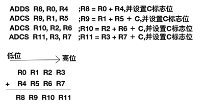 •我們現(xiàn)在要對(duì)一個(gè)128位的數(shù)字進(jìn)行加法操作,因?yàn)槲覀兪褂玫氖?2位的寄存器,所以要存儲(chǔ)一個(gè)128位的數(shù)字,我們需要4個(gè)(128 / 32 = 4)寄存器。所以我們假設(shè)R0,R1,R2,R3寄存器中分別由低到高存儲(chǔ)著第一個(gè)數(shù)字,而R4, R5, R6, R7存儲(chǔ)著第二個(gè)數(shù)字。下方就是兩個(gè)128數(shù)字相加操作的ARM匯編指令。我們將結(jié)果存儲(chǔ)在R8, R9, R10, R11這四個(gè)寄存器中。首先我們執(zhí)行的是將兩個(gè)數(shù)的最低位相加并設(shè)置C標(biāo)志位(ADDS R8, R0, R4),然后在進(jìn)行下一位的操作,對(duì)R1和R5中的值進(jìn)行相加,在相加后再加上上次操作的進(jìn)位,然后再設(shè)置標(biāo)志位,以此類(lèi)推。這樣我們最終的值就存儲(chǔ)在了R8-R11這四個(gè)寄存器中。