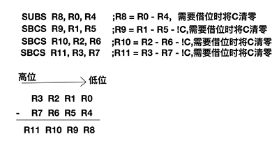 •SBC R0, R1, R2 ; R0 = R1 - R2 - !C •帶借位的減法,假如我們當(dāng)前的寄存器是32Bit, 如果兩個(gè)64bit的數(shù)值進(jìn)行減法操作就要使用到SBC借位操作。因?yàn)楫?dāng)兩個(gè)數(shù)值在進(jìn)行減法操作時(shí),如果需要借位時(shí)就會(huì)把C標(biāo)志位進(jìn)行清零操作,所以在進(jìn)行SBC操作時(shí)需要將C標(biāo)志位進(jìn)行取反操作。下面我們一128位數(shù)值相減為例。該實(shí)例與上述的ADC命令類(lèi)似,在此就不做過(guò)多贅述了。