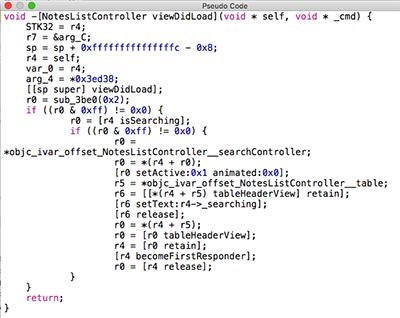 Hopper的功能強(qiáng)大到可以將ARM匯編生成相應(yīng)的偽代碼,如果你看ARM指令不直觀的話(huà),那么偽代碼對(duì)你來(lái)說(shuō)會(huì)更好一些。下方就是Hopper根據(jù)ARM指令生成的偽代碼,如下所示。