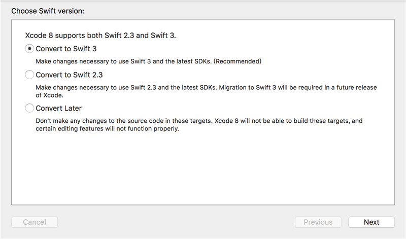 選convert后,會讓你選擇swift的版本。 如果你選擇了3.0版本的swift選項,那等待convert結束后,一般依然有一部分需要你做手動適配。 假如你暫時不想花費時間做swift版本的適配,你可以選擇swift2.3版本,convert并不會轉換任何內容,你的項目也可以像以往在Xcode7中那樣正常運行。此時我們選擇swift2.3: