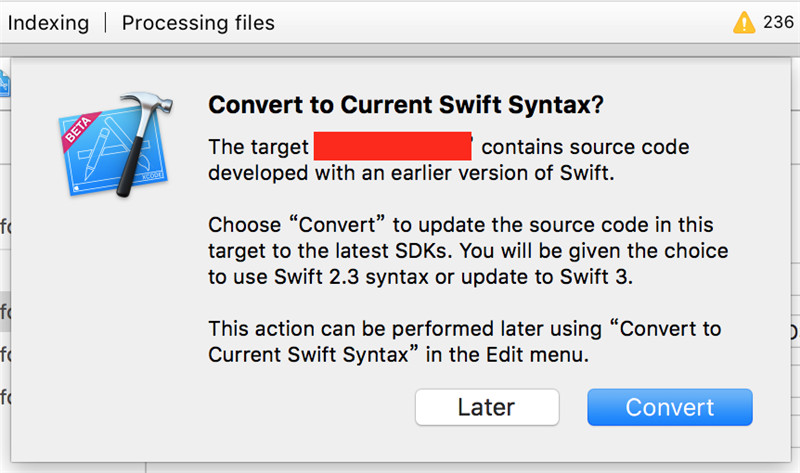 2. swift版本假如你Xcode7的工程中使用了swift,那么你使用Xcode8一打開工程就會出現下面的選項,選擇convert: