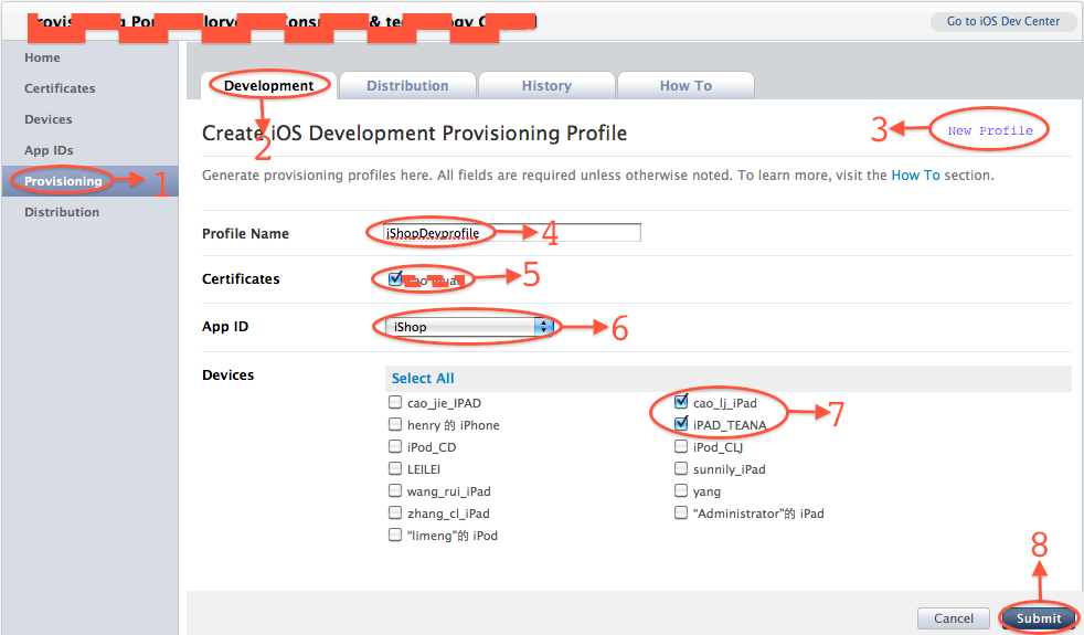 (5)創(chuàng)建Development Provisioning Profiles[開發(fā)許可配置文件](Provisioning| Development|New Profile),具體操作流程如下圖所示: