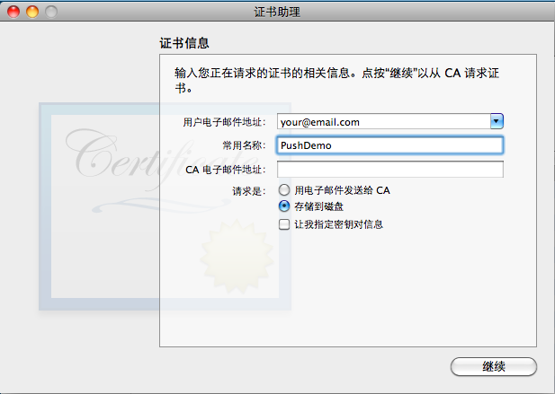 [MacBook-應(yīng)用程序-實用工具-鑰匙串訪問-證書助手-從證書機構(gòu)求證書-證書信息(用戶電子郵箱地址{填寫您的郵箱,如:your@email.com},常用名稱{任意,如:PushDemo},請求是:{單選,選擇‘存儲到磁盤'})-繼續(xù)-保存],這時會在您指定的地方生成你指定的文件,默認為CertificateSigningRequest.certSigningRequest文件,這里命名為:PushDemo.certSigningRequest.在此*.certSigningRequest已經(jīng)生成,具體操作步驟如圖所示。